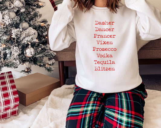 Dasher, Dancer, Prancer, Vixen, Prosecco, Vodka, Tequila Blitzen Unisex Sweatshirt, Christmas Jumper, funny Christmas shirt, Christmas gift