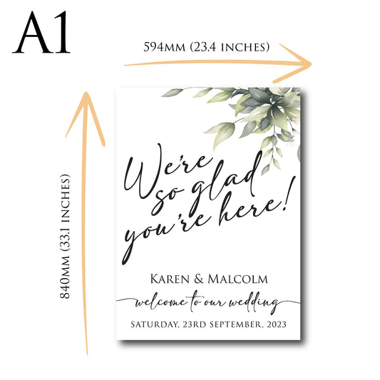 Personalised Wedding Welcome Sign TLPCW004 Physical or Digital, A1 or A2 Portrait Welcome Board for Wedding Easel, We're So Glad You're Here