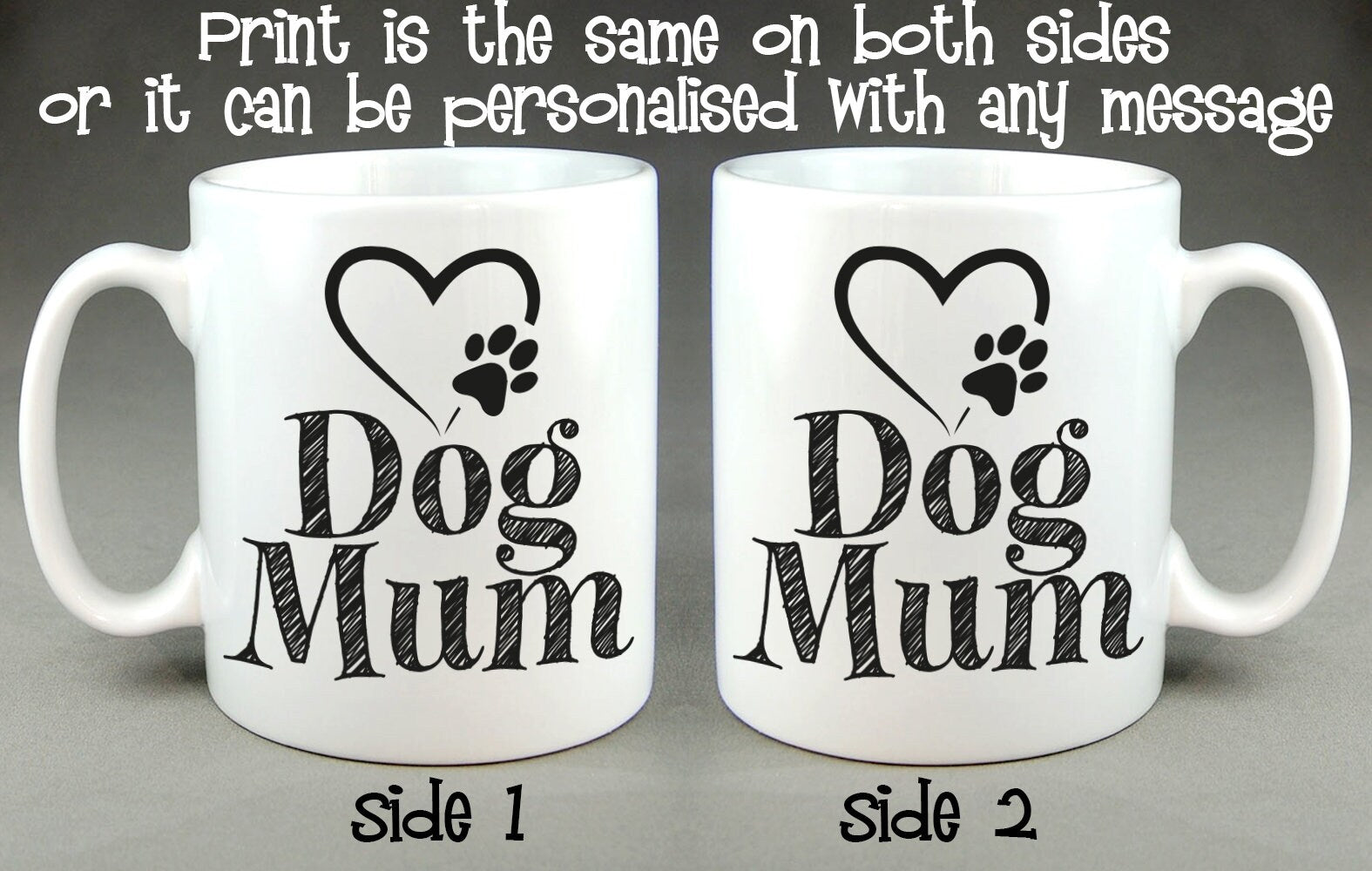 These are completely made to order and can be personalised as shown in the "Love (Your Name)" section or a separate message can be printed on the other side. It's up to you, it's your mug!