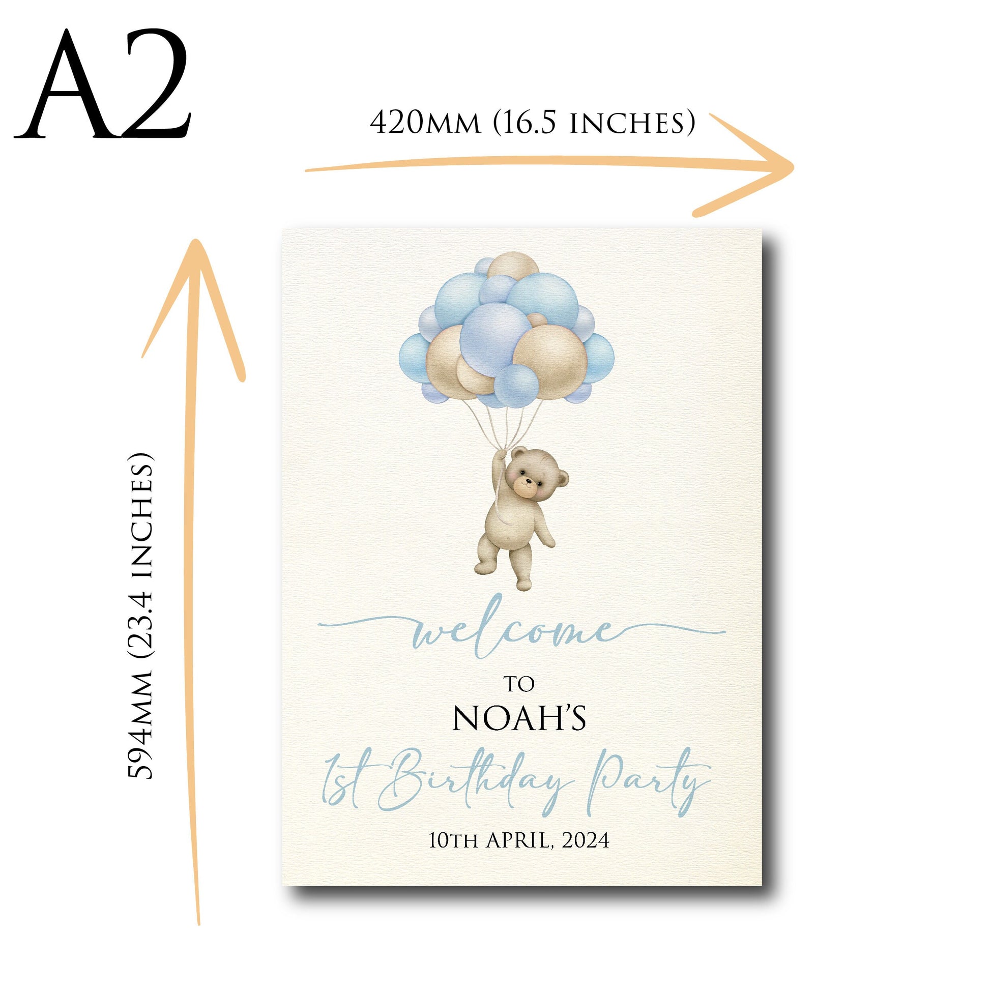 Personalised 1st Birthday Party Welcome Sign FB002 Physical or Digital, Bear Balloon Blue Boy Neutral Hot-Air Baby Birthday Sign