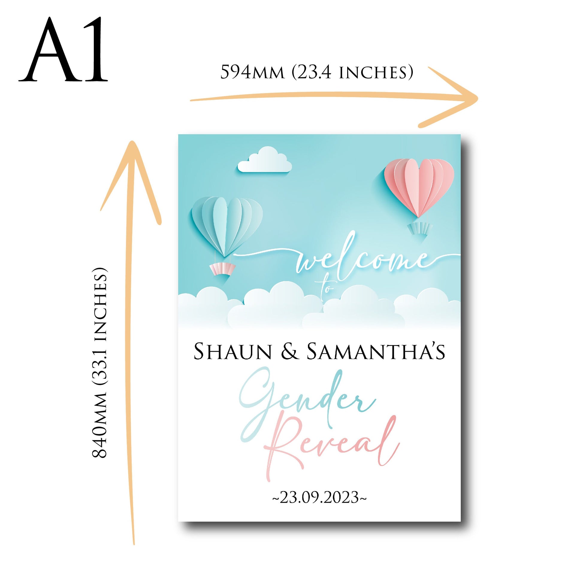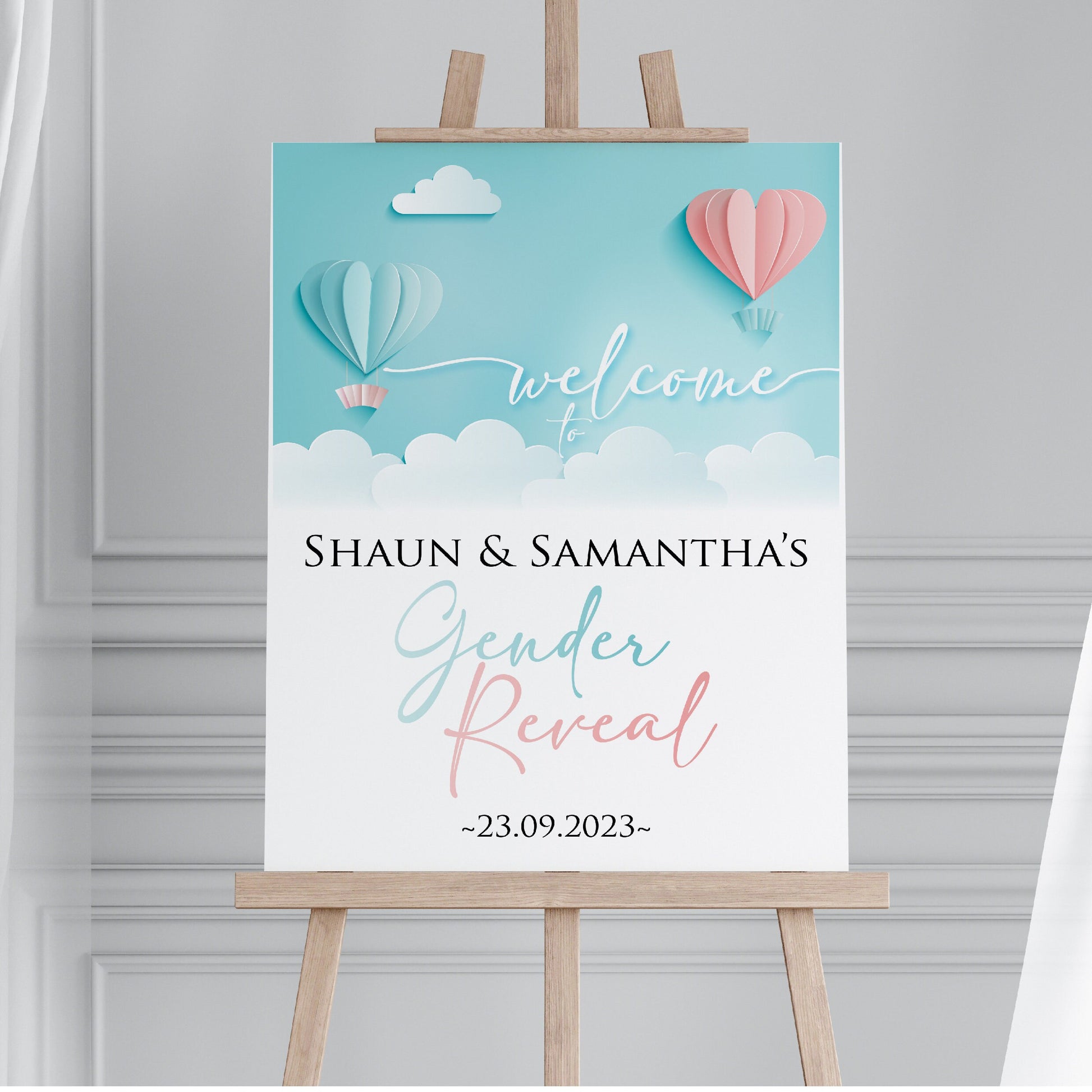 Personalised Gender Reveal Welcome Sign TLPCGR001 Physical or Digital, Blue Pink Hot-Air Balloon Baby Shower Sign