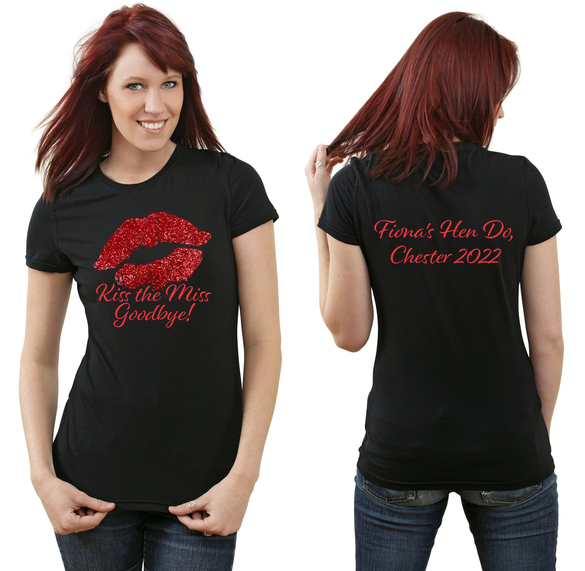Personalised Kiss The Miss Goodbye Hen Party T-Shirt - Red Glitter Lips Tshirt | Hen Do Tee Slogan