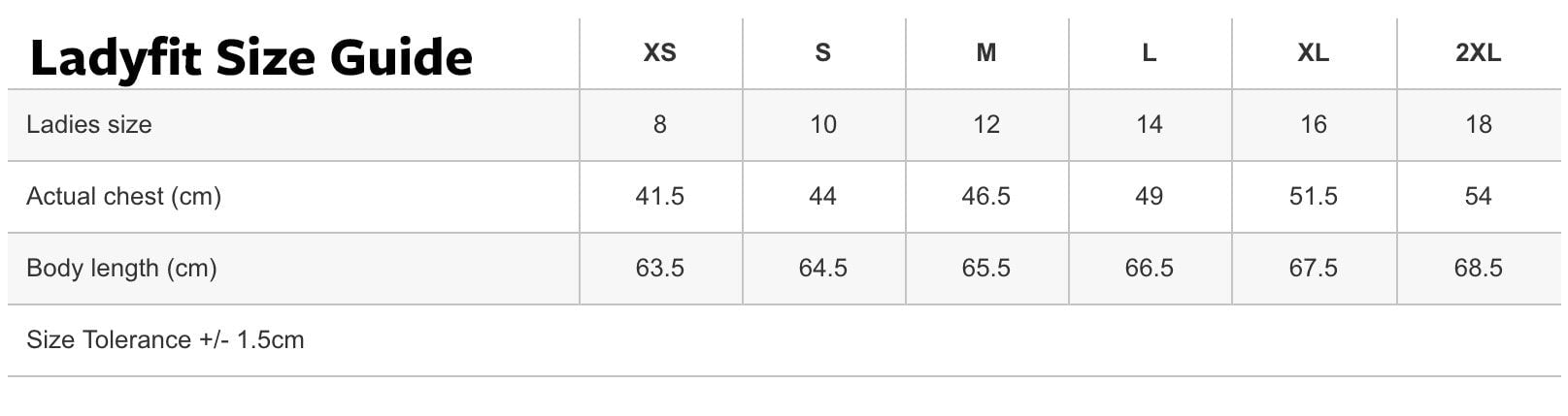 Ladyfit Sizes are listed as XS - (size 8), S - (size 10), M - (size 12), L - (size 14), XL - (size 16), XXL - (size 18)