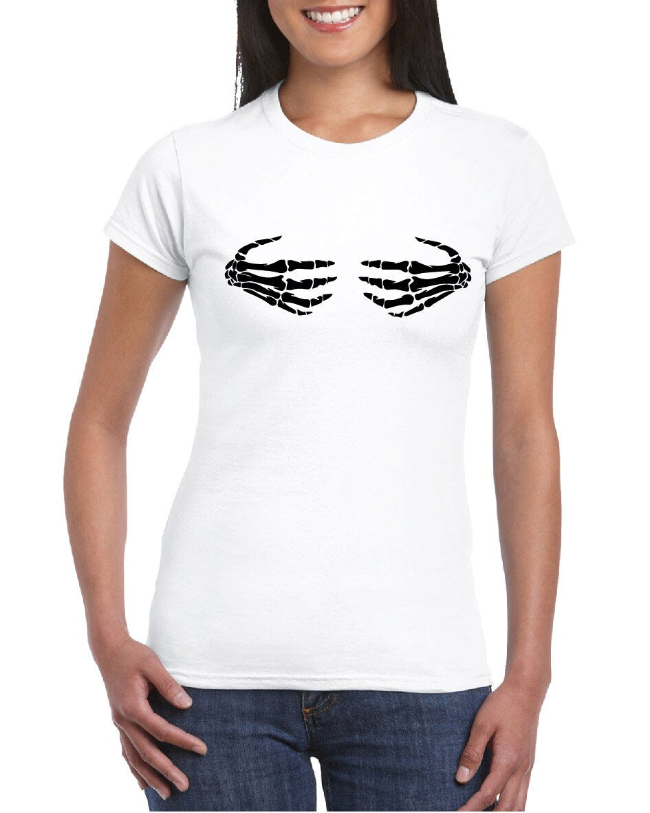 Skeleton Hands on Boobs T-Shirt, Funny, Joke, Halloween, Spooky