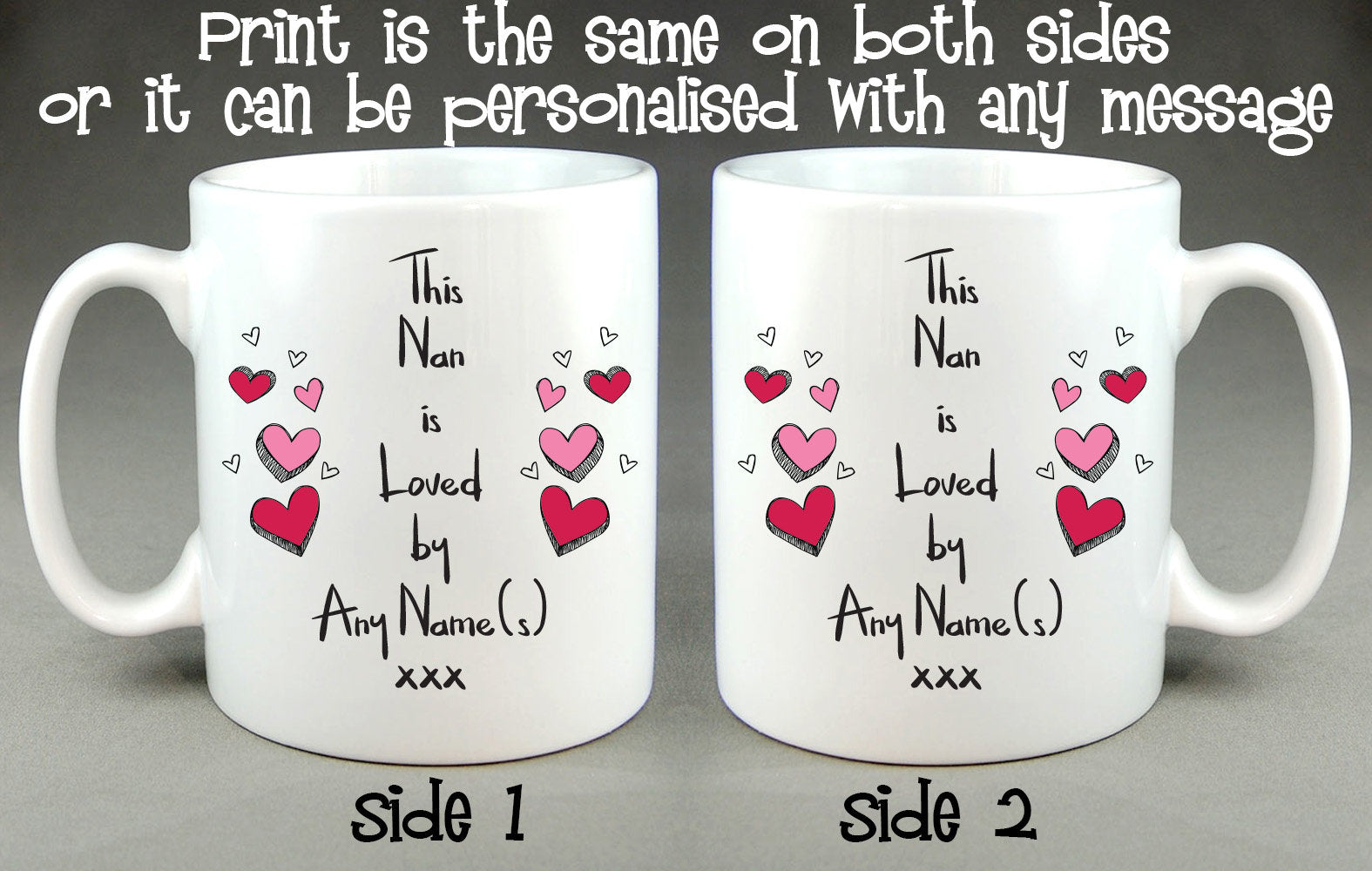 These are completely made to order and can be personalised as shown in the "(Any Name)" section or a separate message can be printed on the other side. It's up to you, it's your mug!