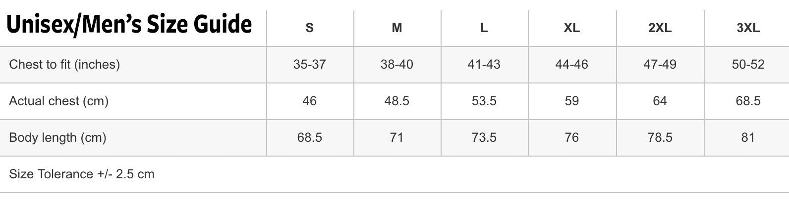 Sizes listed are chest size. These are UK sizes so buyers in the USA may feel more comfortable getting a size up.